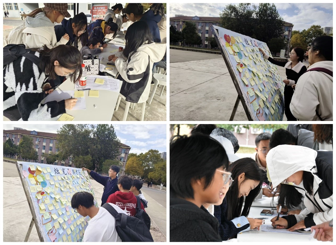在活动中,同学们拿起笔,在纸上写下对自己、同学、朋友和家人的愿望和祝福,如考研上岸、通过英语四六级考试、身体健康、工作顺利等。在活动现场,有的同学认真观看展板图上的减压小建议,从中找到适合自己的减压方法,有的同学将祝福折成千纸鹤的形状,送给来往的路人,将这份温暖与善意传递出去。
