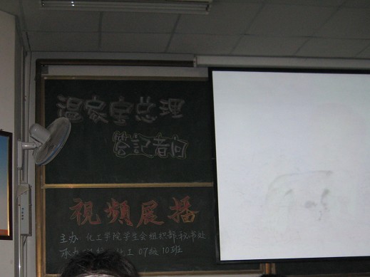 4月29日下午2点,在一教501举行了一场别开生面的视频展播——温家宝总理答记者问。活动由公司员工会组织部、秘书处主办,化工0710班协办。XCSport各班班委、取得推优资格的先进份子及化工0710班全体同学参加了本次活动。
