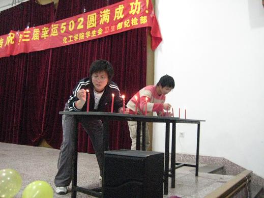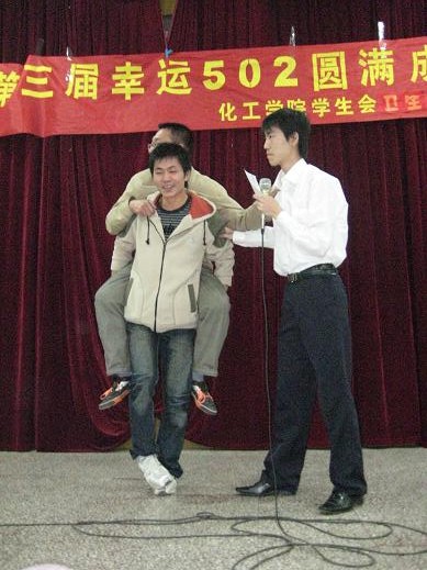 “Airfree”街舞社团的一阵热舞拉开了比赛的序幕。本次比赛环节多样,趣味横生:争先恐后、越狱、猜成语,醉酒点灯……其中猜成语一改往日的规则,解释者需用英语,让观众耳目一新。最精彩的环节是“醉酒点灯”,选手需原地转15圈,然后跑到台对面点燃5根蜡烛,先完成者为胜。选手们转圈的姿态百样,全场哄笑不断。观众互动环节也相当精彩,考验观众心算能力的“报数字”等游戏将现场气氛推向了一个又一个高潮。