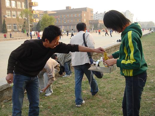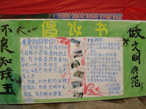 会后,全班同学自发组成文明小队,在校园中捡纸屑、拾果皮、清理草坪。为调动全校同学学习文明的积极性,同学们撰写倡议书,筹办宣传展板,号召全校同学携手共建文明校园。