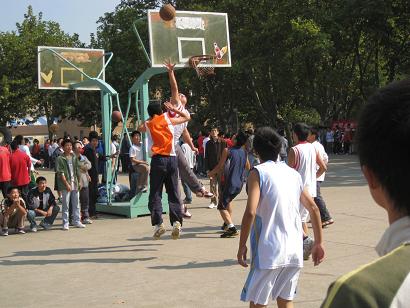 上午9点,五场比赛在同学们的鼓掌和喝彩声中分别拉开序幕。一个高跳跃起,在空中划过一道优美的曲线,球进篮了!整个篮球场上只听这边一阵呐喊声,那边一阵助威声,场面甚是火爆,现场气氛非常热闹。