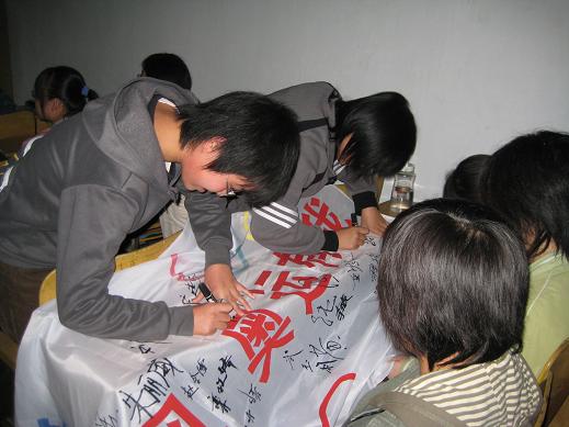 为激发同学们学习奥运知识的积极性,武玉利同学精心准备了与奥运有关的小常识,组织进行了有奖问答环节,给获奖者分发奥运手册,班主任王军老师也参与其中,现场气氛相当热烈。为传承奥运理念,许鹏飞特别组织了签名活动,传动的横幅承载着同学们对奥运会的关注和支持。刘德华的“Everyone is NO.1”的视频短篇所传达的坚强不屈、勇视挫折的精神感人肺腑,朱敬义老师为活动特别创作的诗和对联所体现的关怀和支持催人奋进。