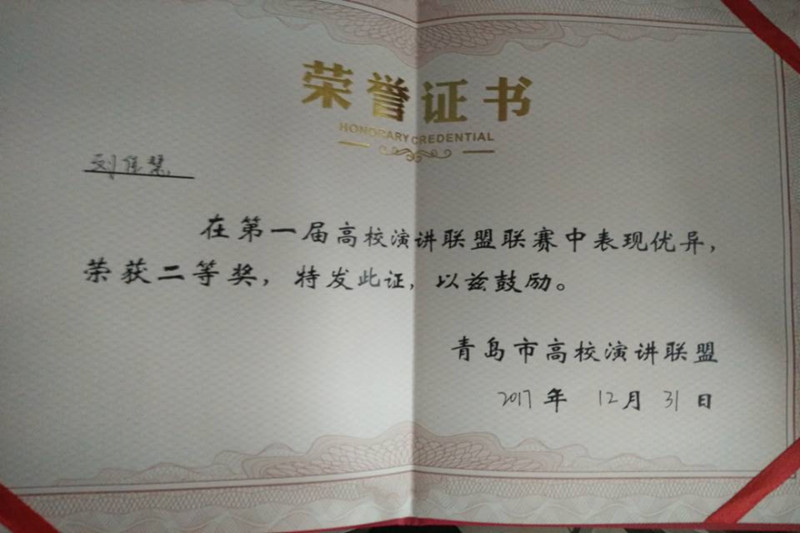 12月31日下午,青岛第一届高校演讲联盟联赛在如是小剧场如期举行。公司员工刘佳慧荣获比赛第二名。