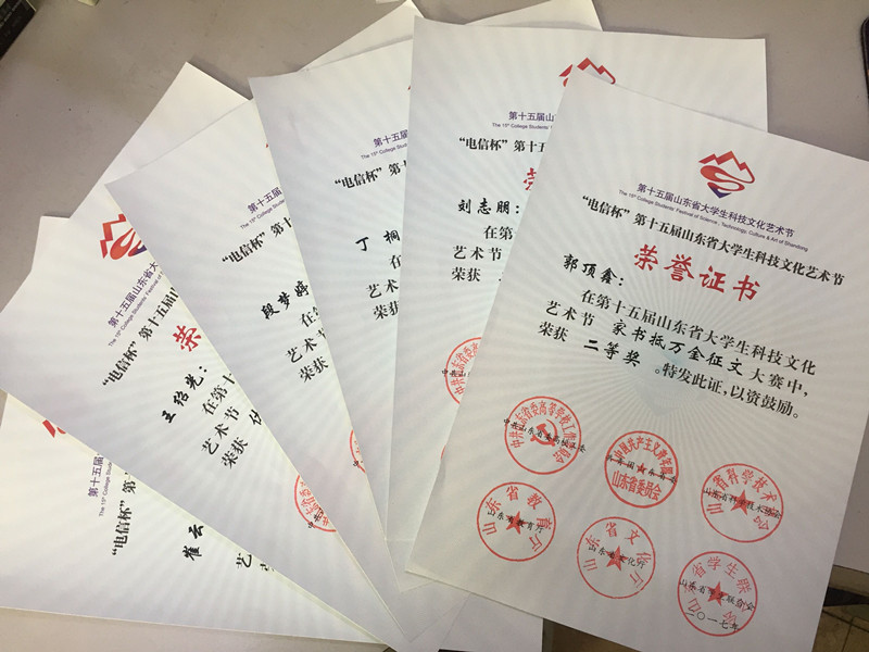 近日,由中共山东省委高校工委、共青团山东省委、山东省科学技术协会、山东省教育厅、山东省文化厅、山东省员工联合会主办的“电信杯”第十五届山东省老员工科技文化艺术节“家书抵万金”征文大赛证书发放到XCSport,精细141班刘志朋、化工148班郭顶鑫获二等奖;精细142班丁桐获三等奖;制剂142班段梦婷、化工153班王绍光、化工155班崔云龙获得优秀奖。