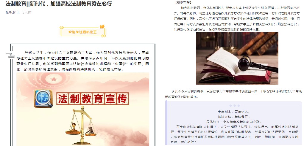 线上宣传,动动手指轻松学法。“扬帆化工”公众号开设普法专栏,推送《新时代,加强高校法制教育势在必行》等文章,通过宣传法治动态要闻、解读社会热点案例、普及相关法律法规等方式,夯实新生法律基础,强化法律意识和法治观念,增强法治教育的传播力与影响力。线下普法,法治观念入脑入心。新生班级开展社会主义核心价值观及中国特色社会主义法治体系学习交流会,各班带班学长向新生们宣讲学法懂法的重要性,详细讲述新时代全面推进依法治国总目标与老员工个人成长的密切联系,以典范事例为证,使新生明晰“科学立法、严格执法、公正司法、全民守法”十六字方针的深刻内涵。通过线上线下相结合的普法教育,20级新生受到极大鼓舞,纷纷表示作为新时代老员工,必须要牢牢掌握掌握宪法知识,在生活中自觉遵纪守法,决不做违背法律的事情,共同建设法治校园和法治社会。