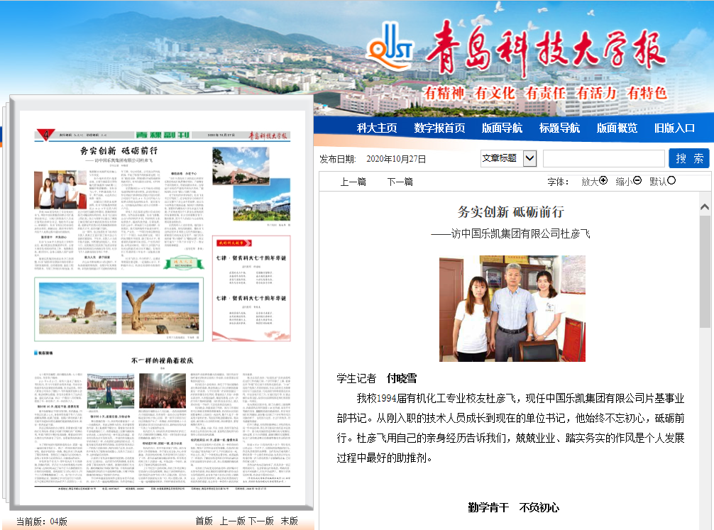 乐凯的科大人是年轻的,他们奋斗在行业前线,身负民族重担。像杜彦飞这样历经岁月考验之后仍然保持初心、砥砺前行的员工还有很多。他们传承发扬着“科大精神”与“橡胶品格”,用实际行动为广大科大学子留下了一笔宝贵的精神财富。(指导老师 李粟)