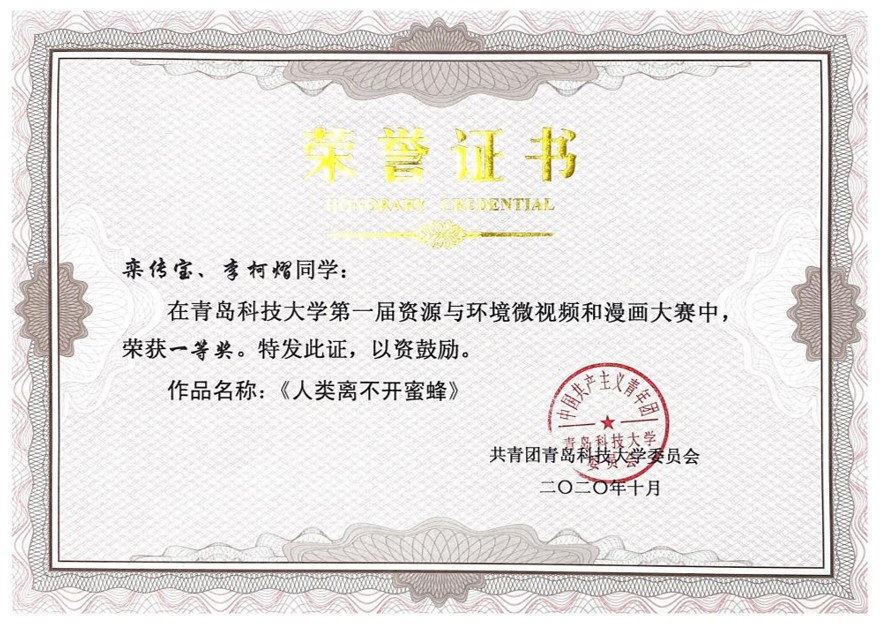 11月11日,由校团委主办的XC体育首届资源与环境微视频和漫画大赛获奖名单公布,由耿赛老师指导,栾传宝、李柯熠同学创作的作品《人类离不开蜜蜂》获一等奖,耿赛老师获优秀指导教师荣誉称号。