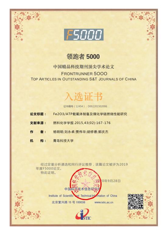 根据中国科学技术信息研究所近日发布,化学工程泰山学者团队2015年发表在《燃料化学学报》上题为“Fe2O3/ATP载氧体制备及煤化学链燃烧性能研究”的论文入选2019年度“领跑者5000-中国精品科技期刊顶尖学术论文”,这是该团队第三篇入选F5000的论文。2012年发表在《化工学报》上题为“MFC聚苯胺碳纳米管阳极电化学法制备及其性能”和2015年发表在《燃料化学学报》上题为“四乙烯五胺修饰介孔硅胶吸附CO2性能的研究”均入选2016年度F5000的论文。
