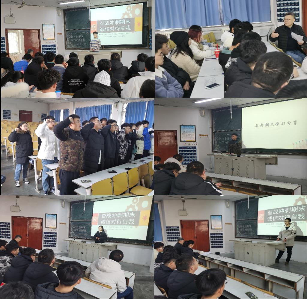 会议伊始,班长郝鑫磊带领班级同学总结期中考试成绩,并从认识考试、调整压力、放下手机、掌握方法四个方面向大家阐述了如何进行期末总复习。之后,马凯瑞和学习委员刘坤总结了自己的学习方法,向大家分享了一些针对性的复习策略。随后,图书馆副馆长李臣深入同学们当中,与同学们促膝长谈,询问同学们的学习和生活情况。他希望同学们珍惜大学时光,做好职业生涯规划,在学习上勤奋努力,在实践中提升自我,在生活中宽以待人,与同学和睦相处,与家长经常联系,并邀请同学们多去图书馆读书。辅导员付文静为大家讲解了提高学习效率的方法,班主任高健强调了诚信考试的重要性。最后,团支书张晓悦带领大家宣读期末冲刺誓词,签订诚信考试承诺书。