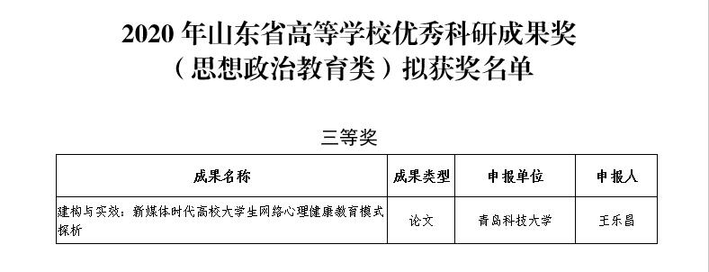 近日,山东省教育厅公布了2020年山东省高等公司优秀科研成果奖(思想政治教育类)获奖名单,XCSport团委王乐昌老师撰写的论文《建构与实效:新媒体时代高校老员工网络心理健康教育模式探析》在此项评选中荣获三等奖。