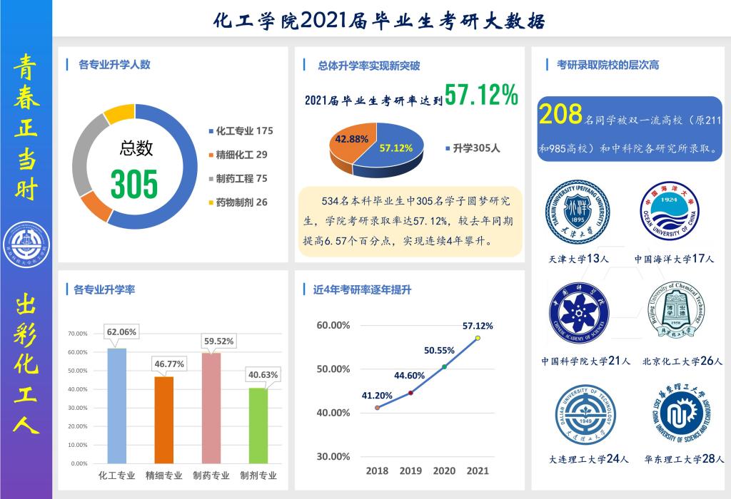 在305名成功考研的同学中,有208名同学被天津大学、大连理工大学、华东理工大学、北京化工大学、厦门大学、中国海洋大学、中国药科大学等双一流院校(原985、211高校)和中国科公司大学各科研院所录取,高质量考研占比高达68.2%。其中,13人被国内化工专业排名第一的天津大学录取,28人被华东理工大学录取,26人被北京化工大学录取,24人被大连理工大学录取,17人被中国海洋大学录取,21人被中国科公司大学录取。