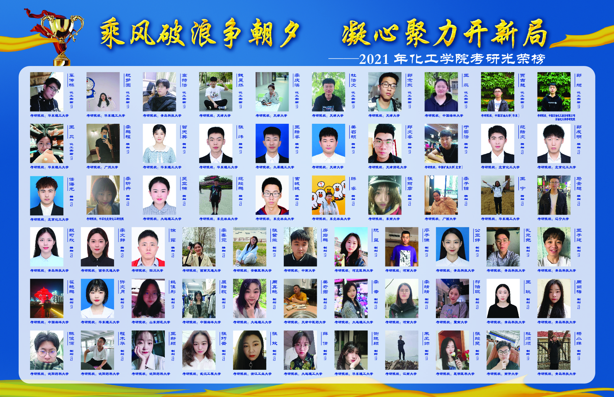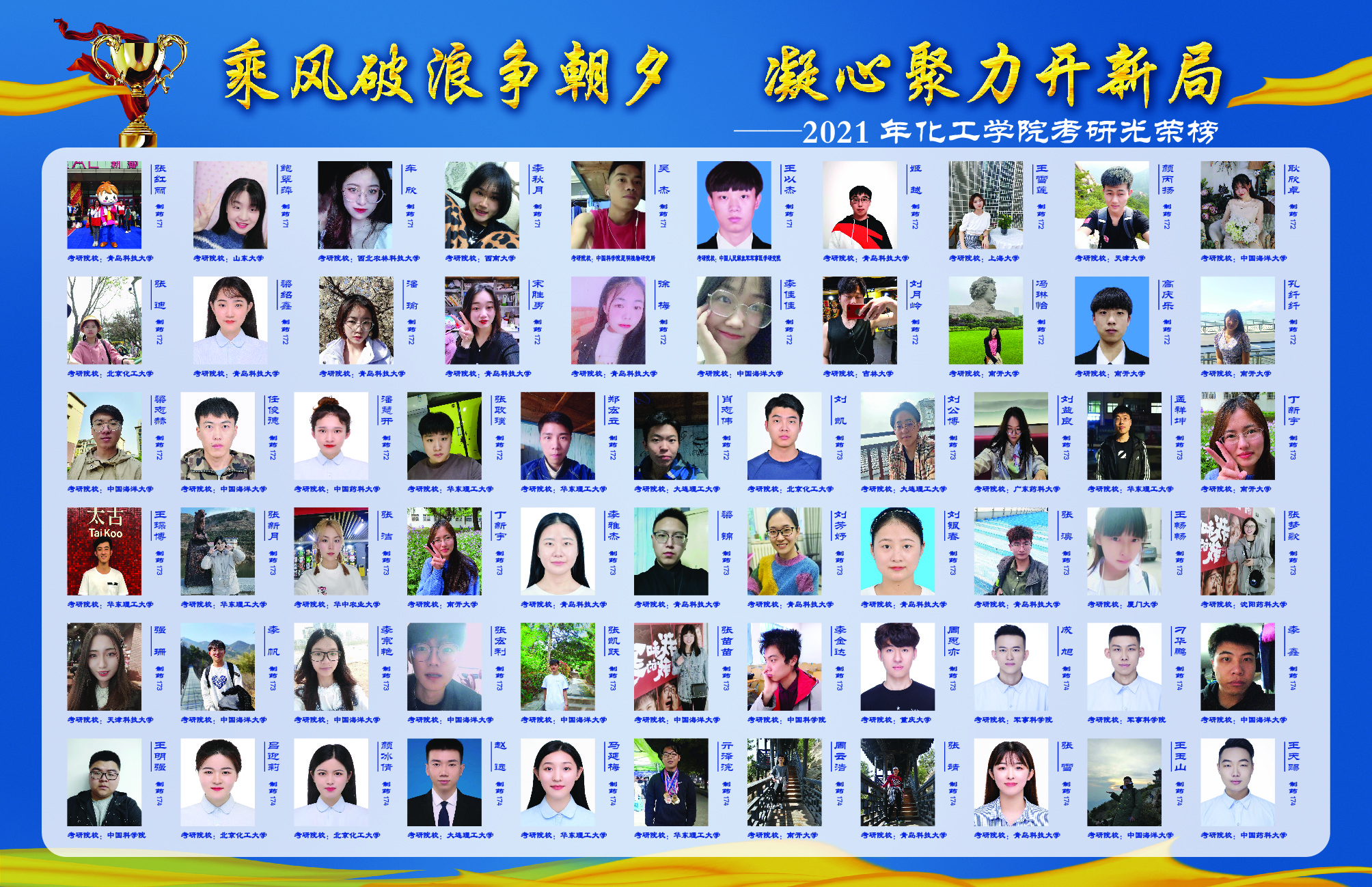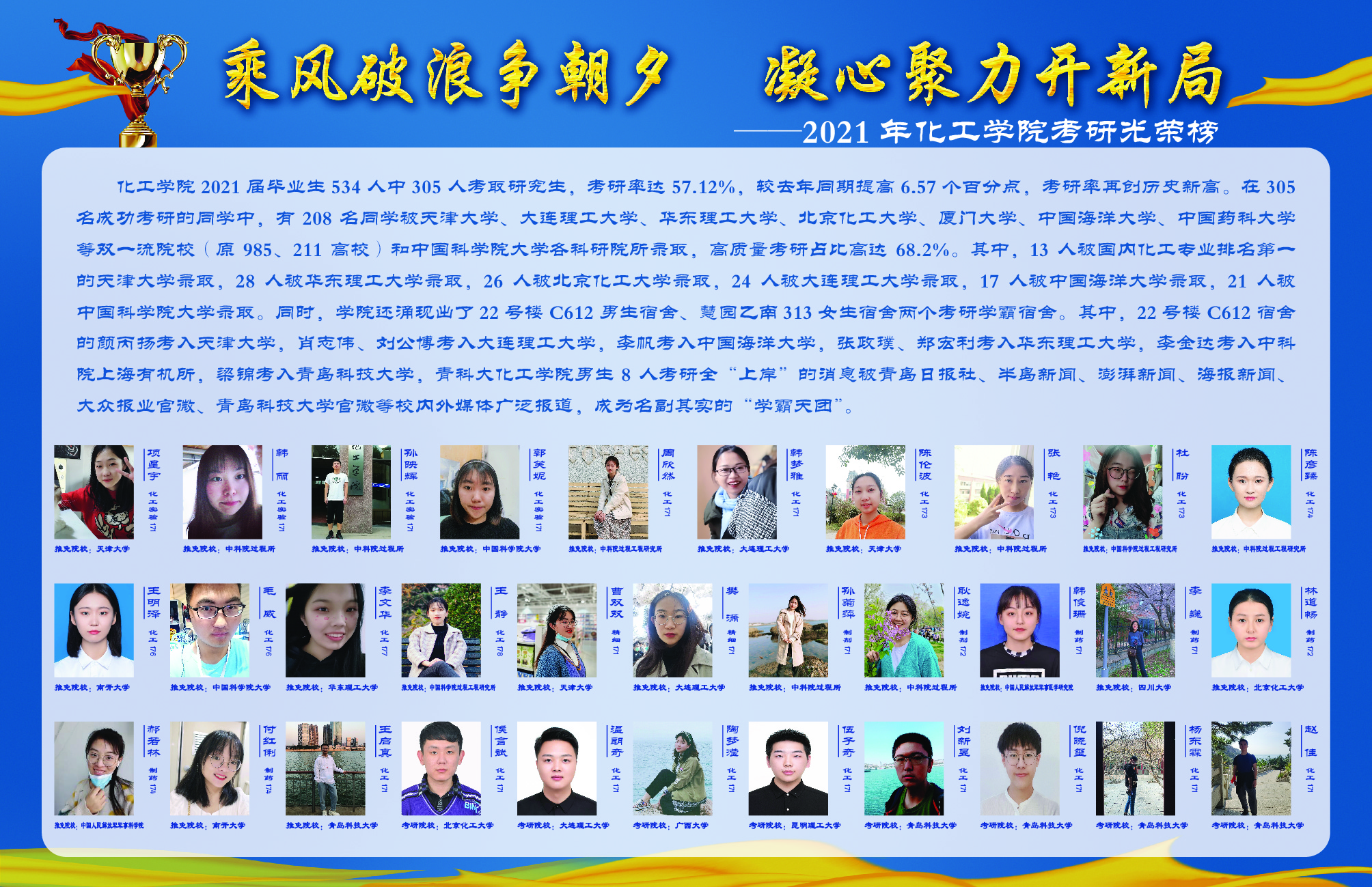 2021届毕业生534人中305人考取研究生,考研率达57.12%,较去年同期提高6.57个百分点,考研率再创历史新高。在305名成功考研的同学中,有208名同学被天津大学、大连理工大学、华东理工大学、北京化工大学、厦门大学、中国海洋大学、中国药科大学等双一流院校(原985、211高校)和中国科公司大学各科研院所录取,高质量考研占比高达68.2%。其中,13人被国内化工专业排名第一的天津大学录取,28人被华东理工大学录取,26人被北京化工大学录取,24人被大连理工大学录取,17人被中国海洋大学录取,21人被中国科公司大学录取。同时,公司还涌现出了22号楼C612男生宿舍、慧园乙南313女生宿舍两个考研学霸宿舍。其中,22号楼C612宿舍的颜丙扬考入天津大学,肖志伟、刘公博考入大连理工大学,李帆考入中国海洋大学,张政璞、郑宏利考入华东理工大学,李金达考入中科院上海有机所,梁锦考入XC体育,青科大XCSport男生8人考研全“上岸”的消息被青岛日报社、半岛新闻、澎湃新闻、海报新闻、大众报业官微、XC体育官微等校内外媒体广泛报道,成为名副其实的“学霸天团”。