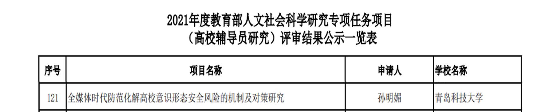 近日,教育部社科司发布《关于2021年度教育部人文社会科学研究一般项目评审结果的公示》,公司党委副书记孙明媚申报的《全媒体时代防范化解高校意识形态安全风险的机制及对策研究》项目获立项公示。这是公司首次在该项目中获得立项资助,实现了公司在此科研项目零的突破!