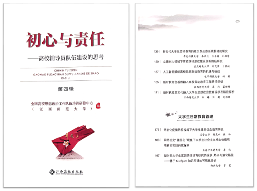 近日,XCSport收到由全国高校思想政治工作队伍培训研修中心(江西师范大学)主编的《初心与责任——高校辅导员队伍建设的思考》一书,XCSport秦洪庆、王乐昌、刘彬等人撰写的论文《新时代老员工劳动教育的意义及生态系统构建的研究》入选该书。全书共收录24篇全国各高校辅导员的优秀论文。