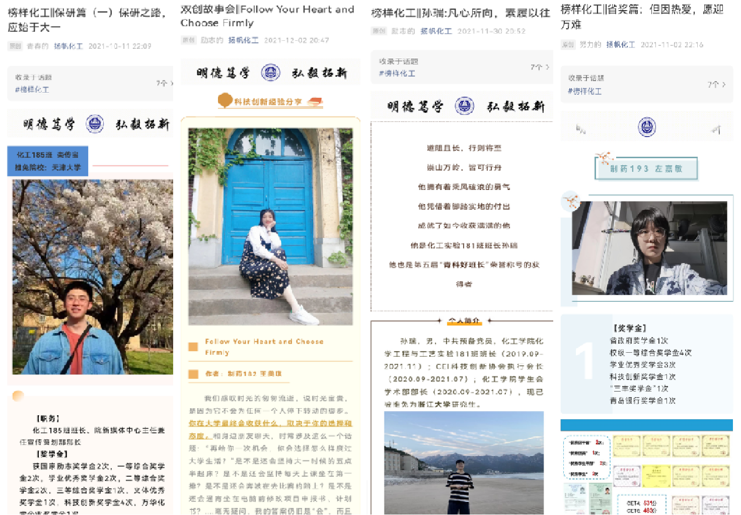 切实发挥榜样的育人导向功能,将评奖评优的工作效果落脚到引领带动员工学先进、学榜样的行动中去。结合“国家奖学金”、“省政府奖学金”、“青科好班长”荣誉获得者的优秀事迹,借助“扬帆化工”公众号,开设“榜样化工”、“双创故事会”、“学霸养成记”专栏广泛宣传,充分发挥先进典型的示范作用,在公司范围形成比学赶超的浓厚氛围。