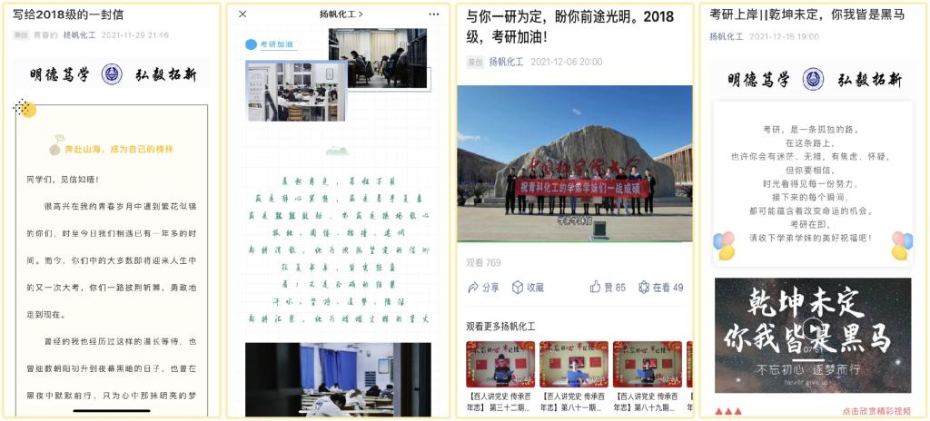 考研进入冲刺期后,公司团委多措并举开展“情暖考研人”系列活动。扬帆化工公众号发布近10篇考研倒计时系列推文,毕业生辅导员为考研学子写下一封鼓励信,优秀毕业生、在校生及辅导员老师分别录制3期考研加油视频,用心守护员工成长,用爱助力梦想起航。