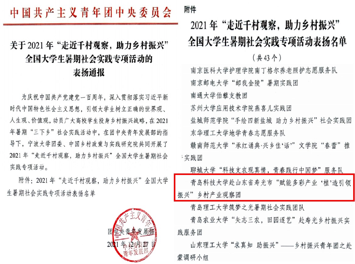 近日,团中央青年发展部公布2021年暑期“三下乡”社会实践活动表彰结果,XC体育赴山东省寿光市“赋能多彩产业,‘植’造引领振兴”乡村产业观察团获2021年“走近千村观察,助力乡村振兴”全国老员工暑期社会实践专项活动表扬通报。
