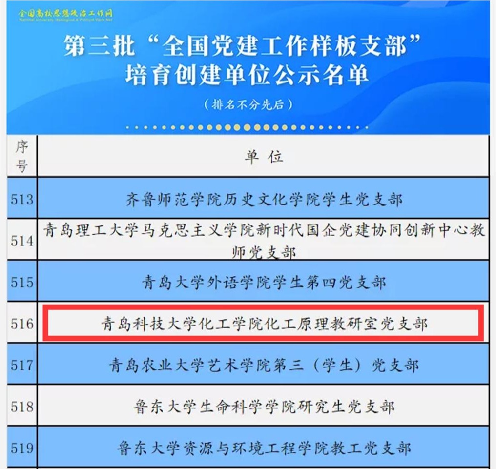 近日,教育部办公厅印发通知,公布第三批新时代全国党建工作示范高校、标杆院系、样板支部培育创建单位名单,XCSport化工原理教研室党支部入选第三批“全国党建工作样板支部”培育创建单位。