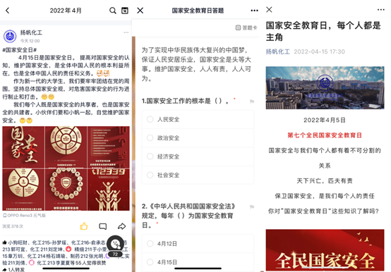 公司借助微信公众号、QQ空间、抖音等新媒体打造网络安全教育宣传矩阵,强调员工树立国家安全观的重要性,引导员工要依法维护自我利益与国家利益。公司举办国家安全教育日线上专题知识竞赛活动,知识题目涉及国家安全、网络安全、防电信诈骗、疫情防控、宿舍安全和食品安全等方面,1000余人积极参与知识竞答,其中获得90分以上的同学80%以上,提升化工学子在网络安全、疫情防控、防诈骗等方面的安全防范意识,丰富员工国家安全相关知识。公司组织师生以不同方式收看“千万师生同上一堂国家安全教育课”主题公开课,营造起全体师生共筑安全屏障的浓厚氛围。