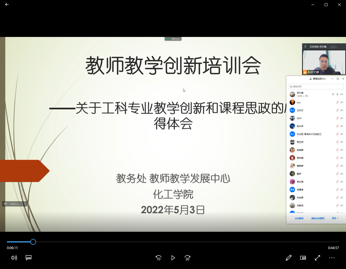 田文德首先介绍了王许云老师和宿烽老师的基本情况,对本次培训内容进行了说明,结合目前一流本科课程建设的有关教学工作安排以及以往教学创新竞赛案例强调了教学创新和课程思政在本科教学工作中的重要性。然后,王许云老师以化工原理课程为例,从教学理念、教学设计思路创新、教学方法创新、评价方法创新、创新性教学效果及成果推广五个方面对课程创新进行了讲解,并重点从两性一度的教学方法创新方面分享了自己的教学经验。宿烽老师以生物化学课程为例,从课程思政意义、课堂导入、教学大纲设计等方面对课程思政进行了讲解,并重点从教师引导、员工主动学习方面分享了自己的教学经验。两位老师的讲座,图文并茂,结合自己多年从教的亲身经历进行针对性分析,内容翔实。最后,田文德对本次培训会内容进行了总结,指出每一名教师都要高度重视教学创新和课程思政工作,提升教师教研和教学水平。