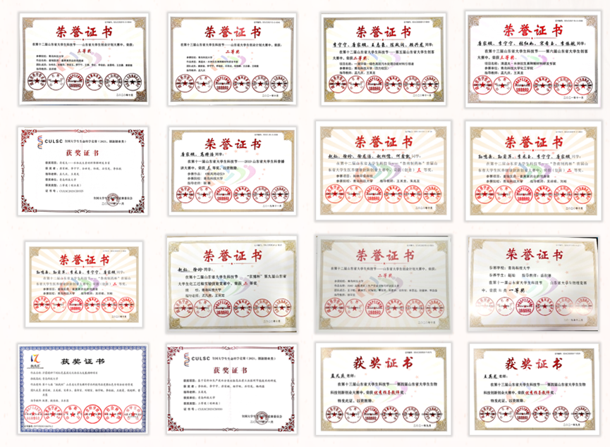 谈到创新创业和学科竞赛,慧园乙北304宿舍更是硕果累累。宿舍六人都积极参与实验课题,进入实验室展开科研工作,累计投出SCI论文3篇,中文核心1篇。她们积极参与科创比赛,互联网+老员工创新创业大赛、“挑战杯”山东省老员工创业计划竞赛、老员工创新创业训练计划、三创赛以及数十项山东省科技节赛事上,都留下了她们奋斗和获奖的身影,累计获得国家级奖励15项,省级奖励58项。李宁宁认为:“实验室的工作虽然枯燥,却有着无限的魅力,虽然过程很辛苦,但是与队友团结协作完成项目的瞬间,那份喜悦是毕生难忘的。在推免复试问答的环节中,各类科创获奖经历也成为了我的亮点,给自己增加了很大的竞争力。”