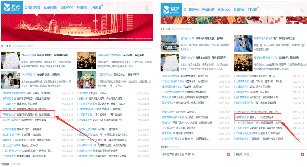 4月份XCSport易班工作站在全国易班头条版面投稿发文2篇,不断提高在全国高校网络易指数上的排名。XCSport易班工作站以饱满的热情和稳健的步伐,不断研究和改进易班的工作方法,继续坚持以“思想政治教育为主线,安全教育为底线”的工作理念,在扎根同学、服务同学的同时,不断推进公司易班品牌化建设,争取在易班网络思政发展道路上取得新的成绩。