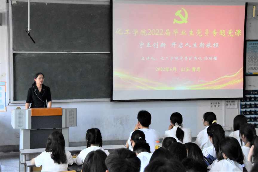 会上,孙明媚从“守正”与“创新”两方面展开授课,希望各毕业生从百年党史中汲取精神动力,从化工先贤身上感悟理想信念,将个人命运同国家、民族紧紧联系在一起,扎根基层,发扬科大精神,将科大化工学子的道路走得更实。毕业生们即将走出校园,扎根各行各业,无论面对什么样的机遇和挑战,孙明媚都希望毕业生们可以在新的岗位上继续发光发热、引路拓荒。孙明媚提到,在新的竞争格局下,创新力将成为毕业生职业发展的立足点、支撑点、着力点,她引用习近平总书记的讲话“惟创新者进,惟创新者强,惟创新者胜”,为毕业生党员深刻阐明了创新在以后就业中的重要性,希望毕业生在创新之路上炼出真知、淬出菁华。