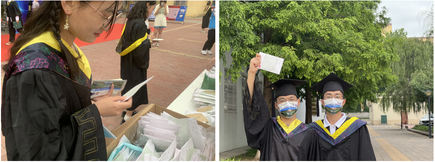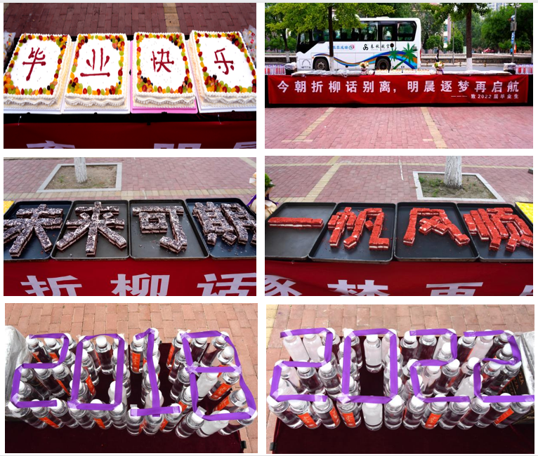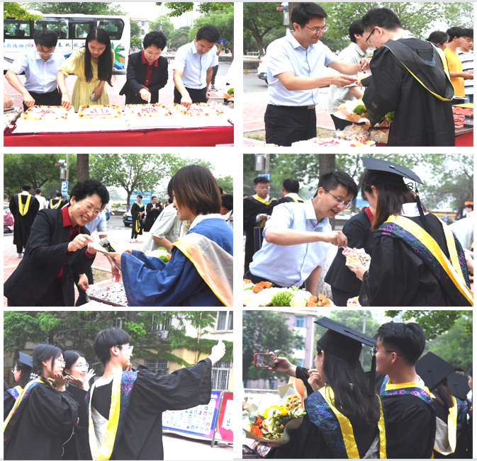 欢送仪式上,老师们为毕业生分发蛋糕、定制饮用水,并送上他们对毕业生的美好祝福。同学们向老师致以衷心的感谢,不仅是对此次的蛋糕宴,还有四年来老师在学习和生活上对同学们照顾和关怀。仪式结束后,毕业生与老师们合影留念。