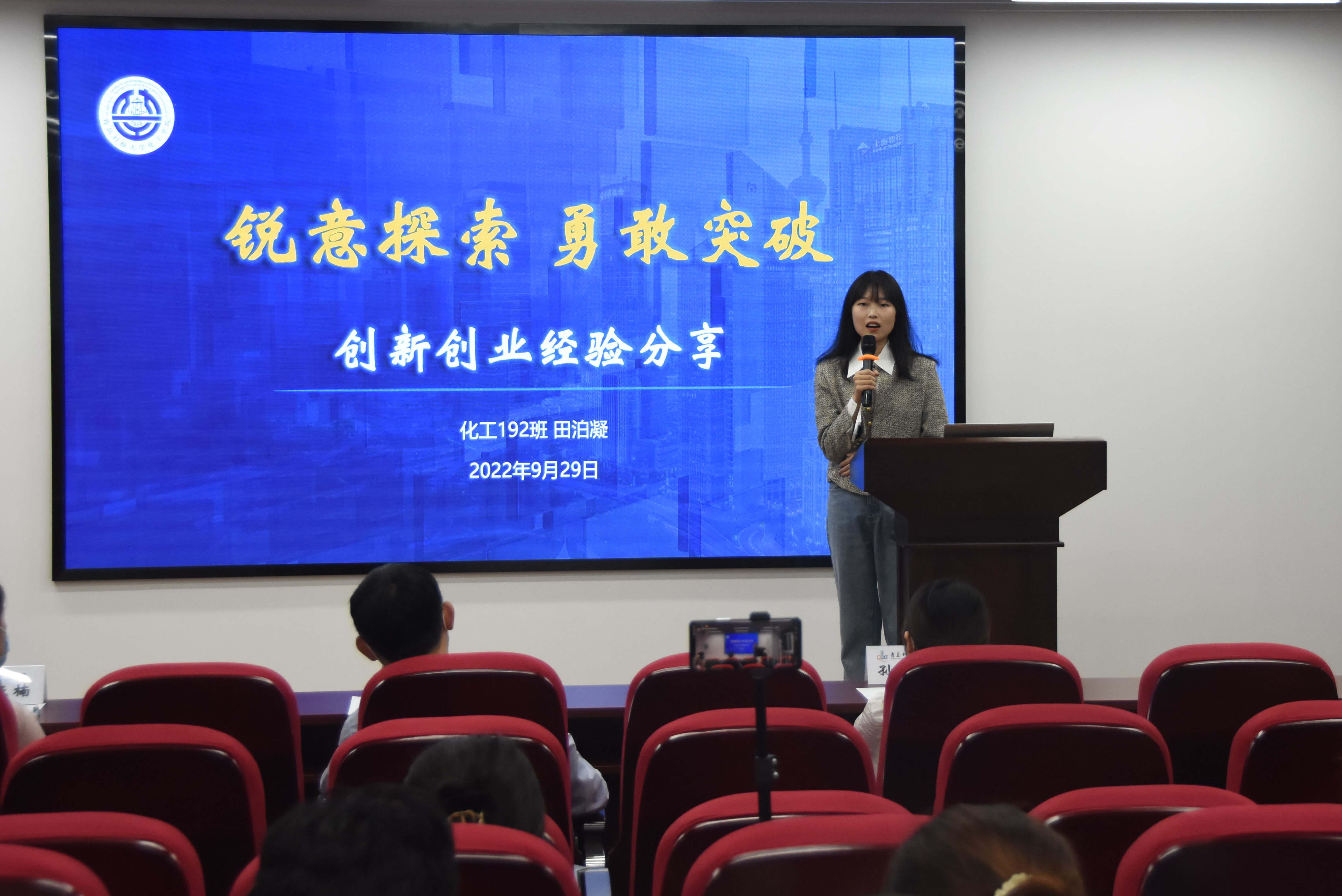 首先,田泊凝通过分享自己的个人参加科技创新竞赛的经历,向我们介绍省级、国家级重要赛事,并根据实际情况提出了几点建议。她讲到科技创新队伍的合作十分重要,需要各个人员特长技能的发挥,共同完成比赛前的准备工作、赛事中的宣讲等等,这些都需要长时间的锻炼与准备,她提醒道一等要做好时间的规划。