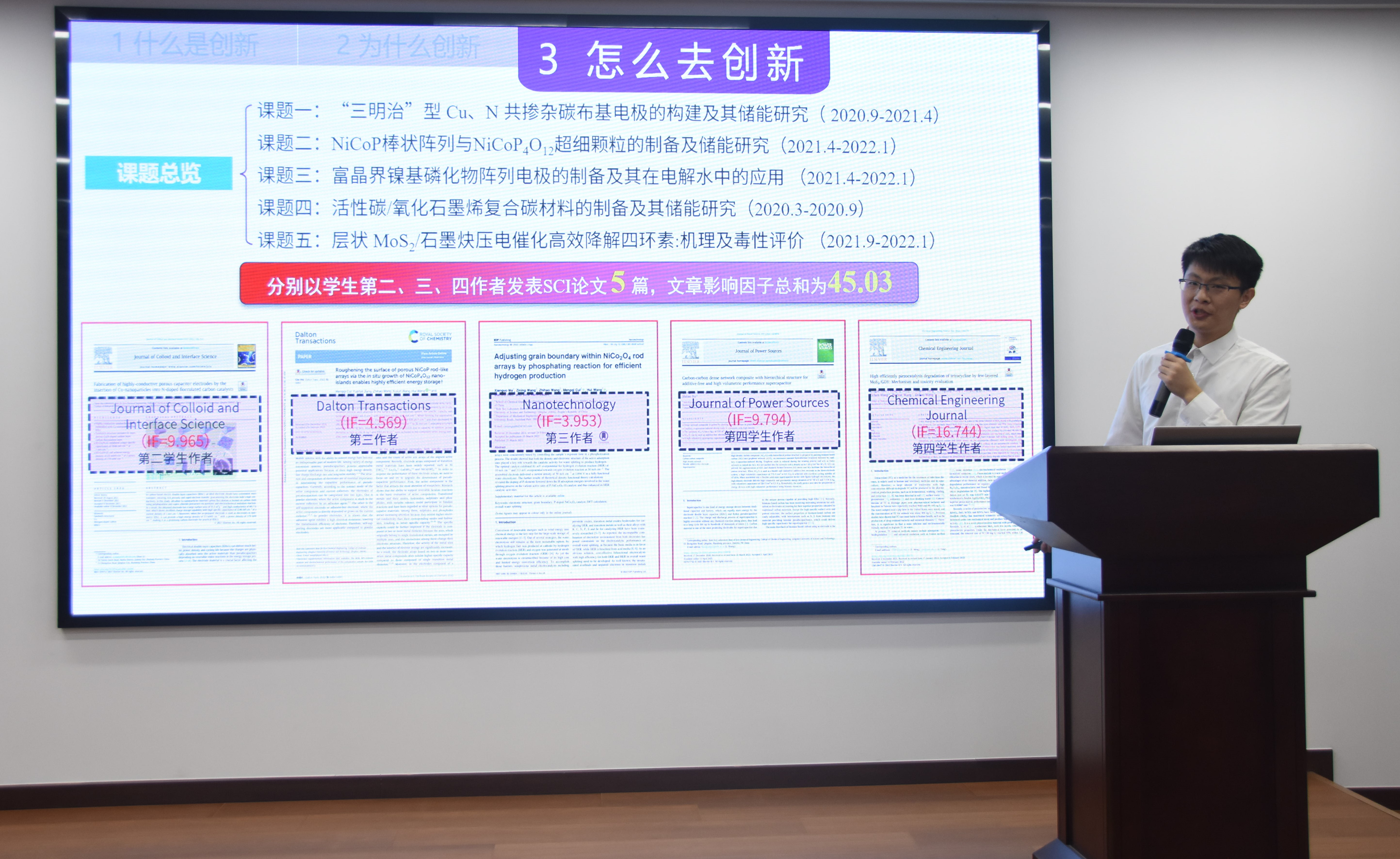 王志豪从什么是创新、为什么创新、怎么去创新三个方面进行分享。他表示拥有创新意识是创新的基础,要善于创新、敢于创新,用创新达到进步的目的。他强调如何体现创新这一方面。他用自身实例从查阅文献到发布论文,按照顺序介绍创新的基本步骤。最后,他做出赛项总结,对学弟学妹们给予鼓励。