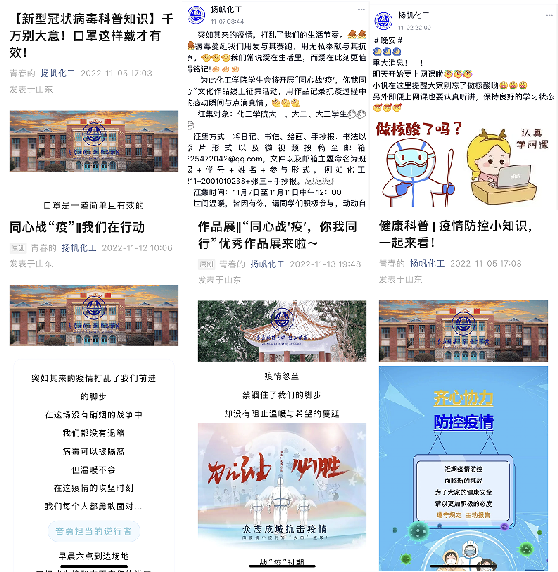 公司积极利用网络新媒体等平台,坚持“员工工作不间断,思想教育不断线”,多渠道正面引导,加强疫情防控教育,宣传国家政策,引导广大师生响应政府号召,坚定信心,同舟共济,齐心协力抗击疫情。通过官方微信公众平台、抖音等媒介,多途径、全覆盖做好宣传防控工作,推送防疫信息10余篇次。开展“同心战‘疫’ 你我同行”文化作品线上征集活动、“共抗疫情 同心同行”摄影/短视频大赛,客观正确看待疫情带来的影响,丰富多彩的活动形式展现了青年员工抗疫必胜的决心,传播了正能量,充分发挥了基层团组织的战斗堡垒作用。