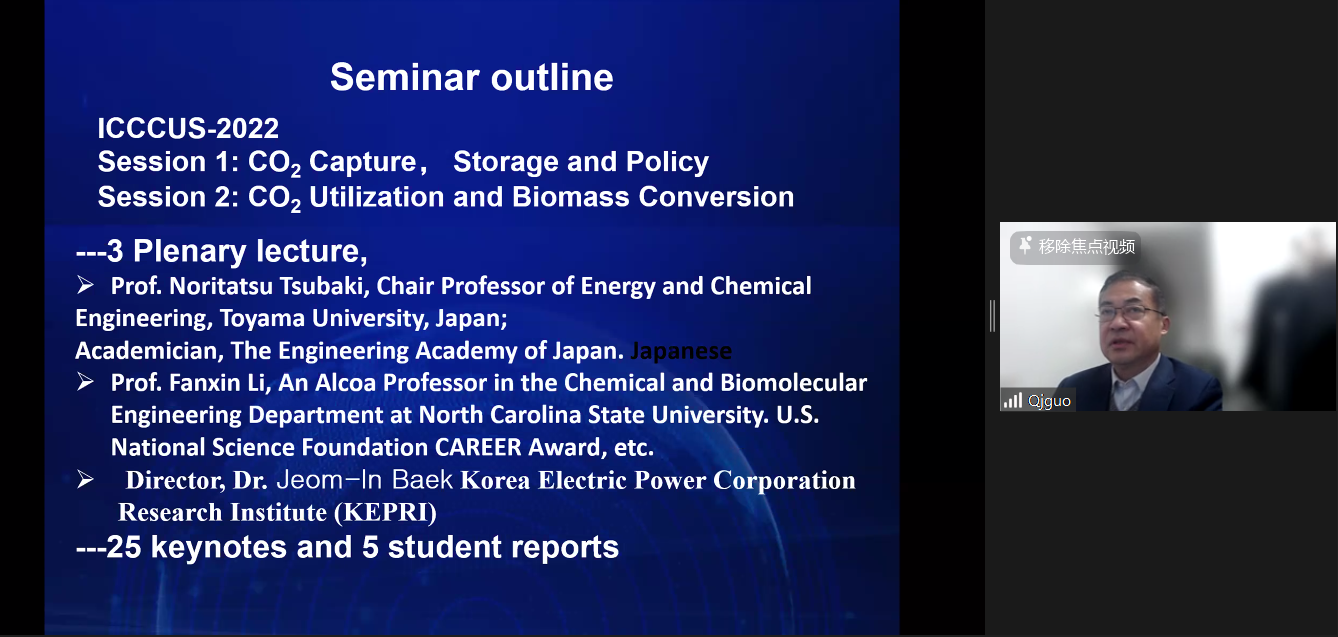 12月3日,2022国际碳捕获和碳利用会议(ICCCUS-2022)顺利召开。由于疫情原因,本次大会采取线上形式举行,由XC体育和Fine chemical engineering期刊主办,宁夏大学、中国科公司山西煤炭化学研究所、石嘴山市科学技术局、长三角环保能源化工产业创新研究院和山东省化学化工学会化学工程专业委员会协办。XCSport郭庆杰教授担任大会主席,清华大学岳光溪院士、日本工程院院士富山大学Noritatsu Tsubaki教授、长三角环保能源化工产业创新研究所张志雄经理、XCSport田红景副教授等担任国际顾问委员。