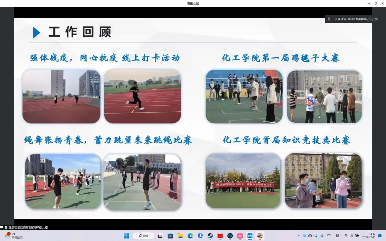 12月13日下午两点三十分,2022-2023学年第一学期员工会总结大会在线上举行。XCSport团委书记秦洪庆、团委副书记耿赛、团委老师李亚楠、殷佳珞、孙希玲、乔毅、于文倩,员工会主席团成员以及各部门部长出席本次会议。员工会全体成员参加本次大会。