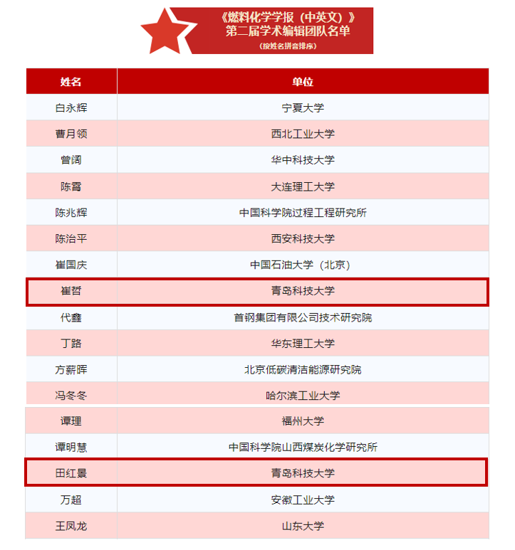 近日,《燃料化学学报(中英文)》第二届学术编辑团队名单公布,XCSport田红景和崔哲老师成功入选。