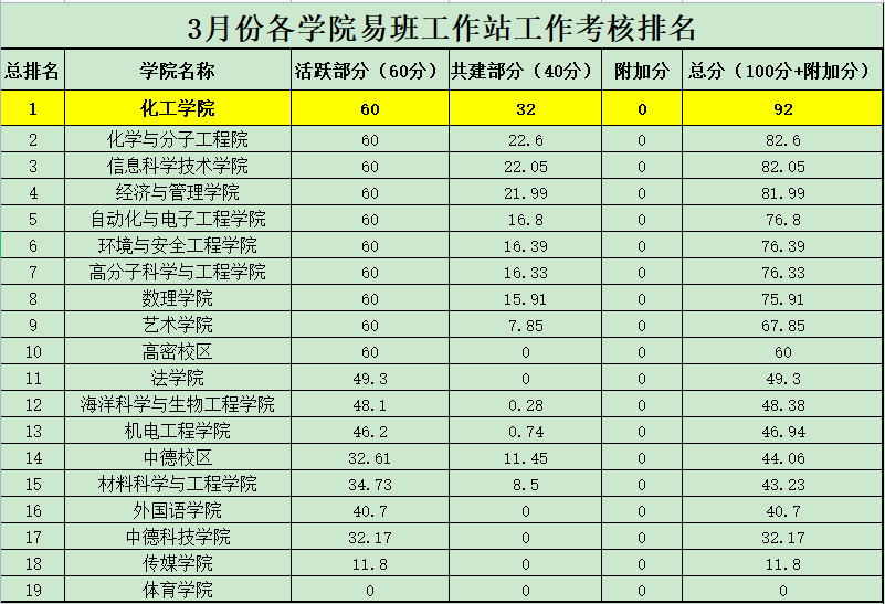 4月18日,XC体育易班发展中心公布了2023年3月份各公司(校区)易班工作站月度工作考核排名,XCSport易班工作站以总成绩92分位居全校第一名。