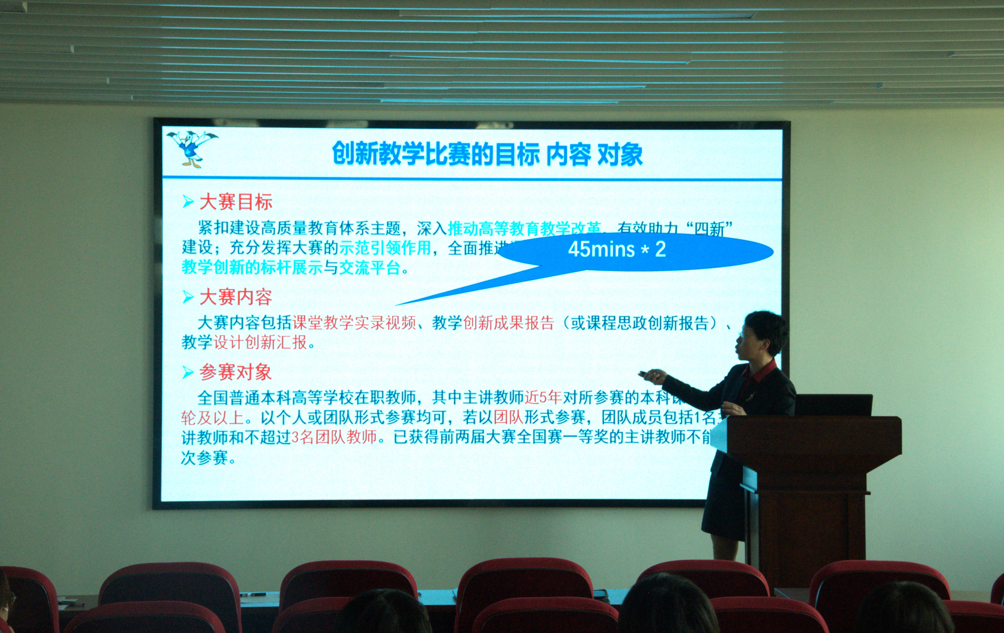 会上,王许云通过典型实例介绍了当今教学设计与创新的具体情况,并从课程概况、痛点分析、创新举措、创新成效、成果辐射五个方面展开。她先对教学大赛的总体要求进行概括,明确了教学设计与创新的大体方向;接着,针对教学大赛中出现的问题进行具体分析,寻找不足,直击痛点;并针对所出现的问题,提出了相应的解决方法,结合自身实例,进行实践分析,她指出通过阶梯建构等一系列创新举措,实现学习动力提升、责任意识增强等创新成效。