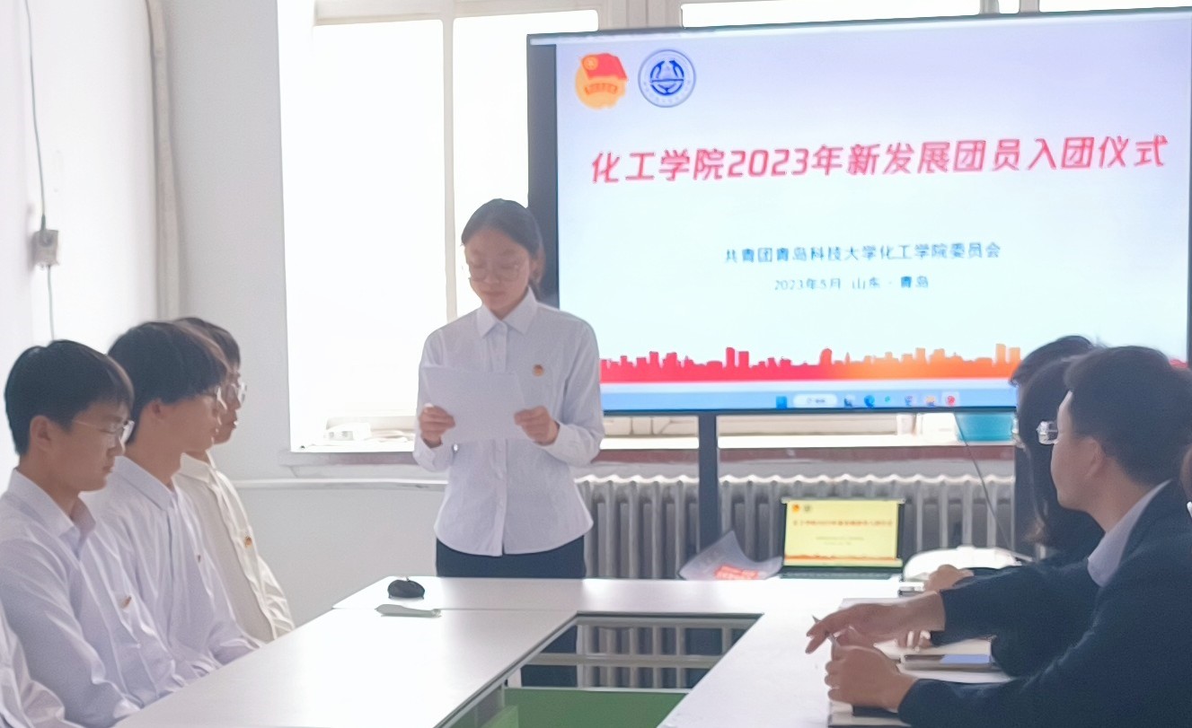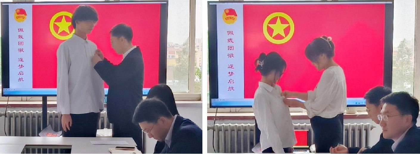 仪式在庄严嘹亮的国歌声中拉开帷幕,乔毅宣读8位新发展团员名单。殷佳珞、孙希玲、乔毅为新发展团员颁发团徽。