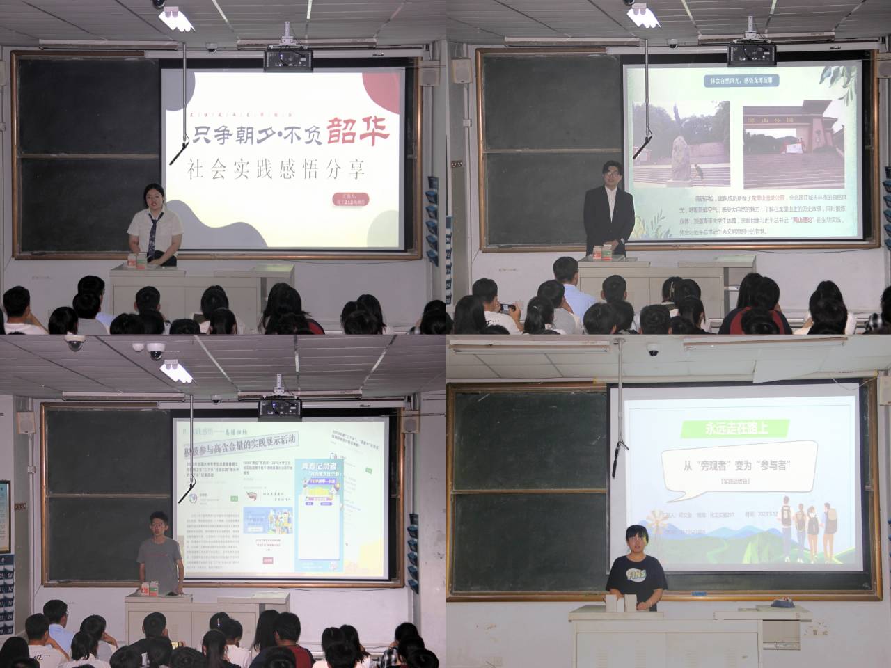 各团队代表从等多个方面展示了队员们在暑假社会实践中的丰富经历与所得收获,分享了活动中的所见、所闻、所感。会上,刘乙鸣分享了新闻稿件撰写方法及如何通过社会实践与科技创新相结合,更好地将实践成果转化成科创成果。王鹏旭通过讲述团中央专项实践活动的开展情况,向同学们介绍了申报流程、实践准备以及后期收获。李佳欣主要分享青鸟计划的参与方式,从自身的实习经历出发,全方位讲解如何参加青鸟计划、如何实现自身素质的提高。杨浉茁围绕什么是社会实践,为什么要进行社会实践展开了暑期多次进行社会实践的故事和感悟。邓文慧分享了她自大一入学以来的实践经历,号召同学们从实践的“旁观者”变为“参与者”。