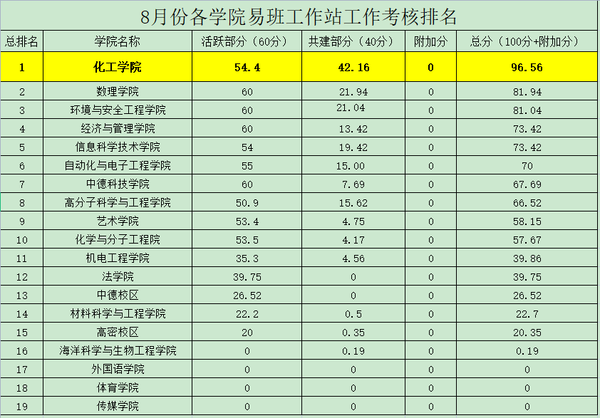9月20日,XC体育易班发展中心公布了2023年8月份各公司(校区)易班工作站月度工作考核排名,XCSport易班工作站以总成绩96.56分位居全校第一名。