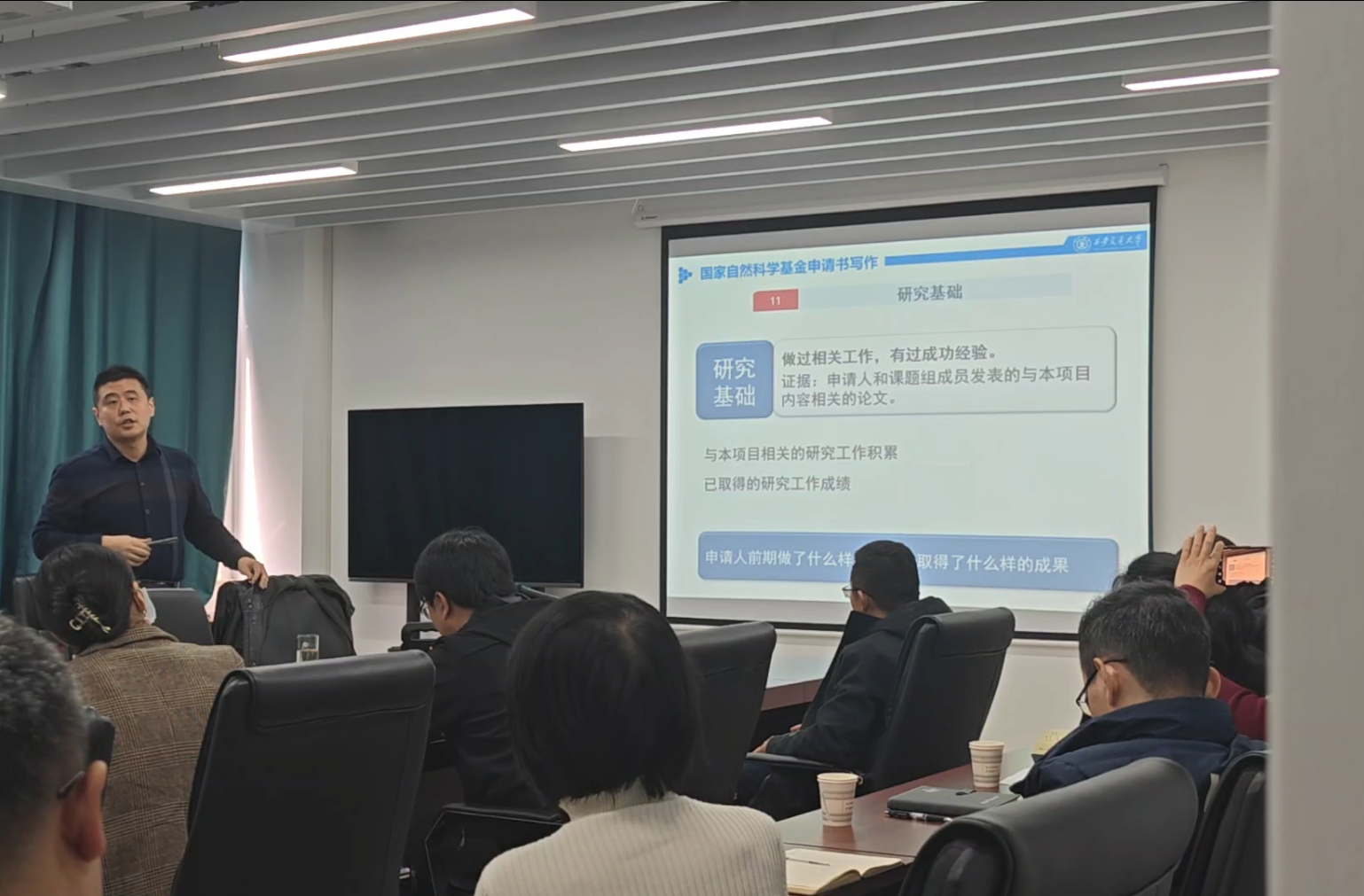 培训会上,何会结合自己长期从事国家自然科学基金管理工作的丰富经验,从管理者角度总结国家自然科学基金申请书撰写经验,从基金申报的前期准备、科研选题、申请书的撰写及常见问题等几个方面,对申请课题的理论依据、前期基础、申报书各部分撰写等环节进行了详细阐述。