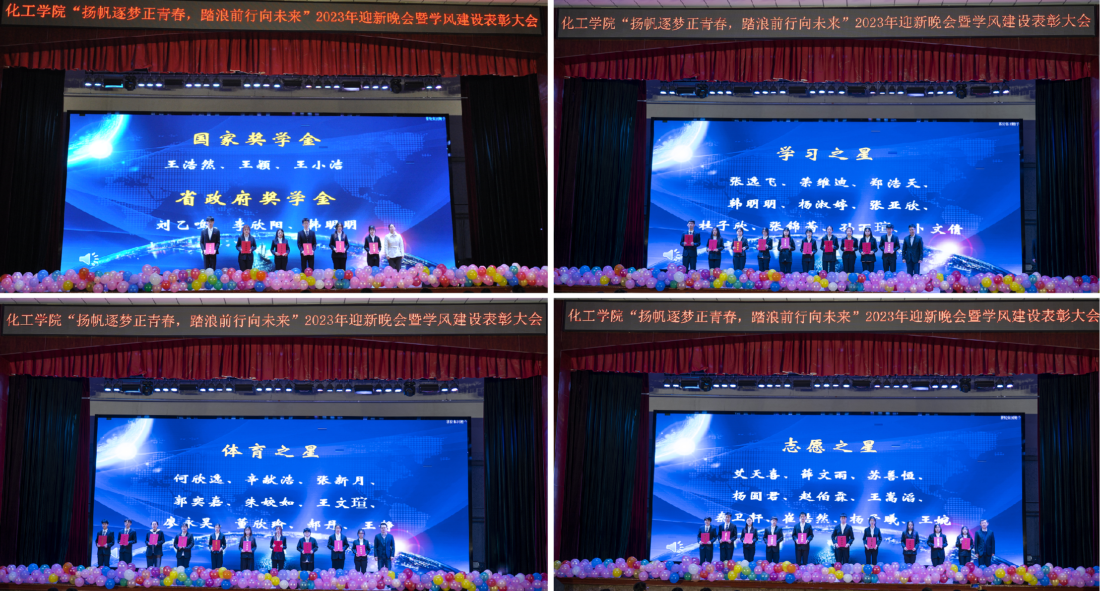 晚会中场进行学风建设表彰颁奖环节,孙明媚为国家奖学金、省政府奖学金、山东省先进班集体、青科好班长获奖员工颁奖;李春家为“十大自立自强标兵”、学习之星、实践之星获奖员工颁奖;刘永卓为体育之星、科创之星获奖员工颁奖;秦洪庆为获得志愿之星获奖员工颁奖。