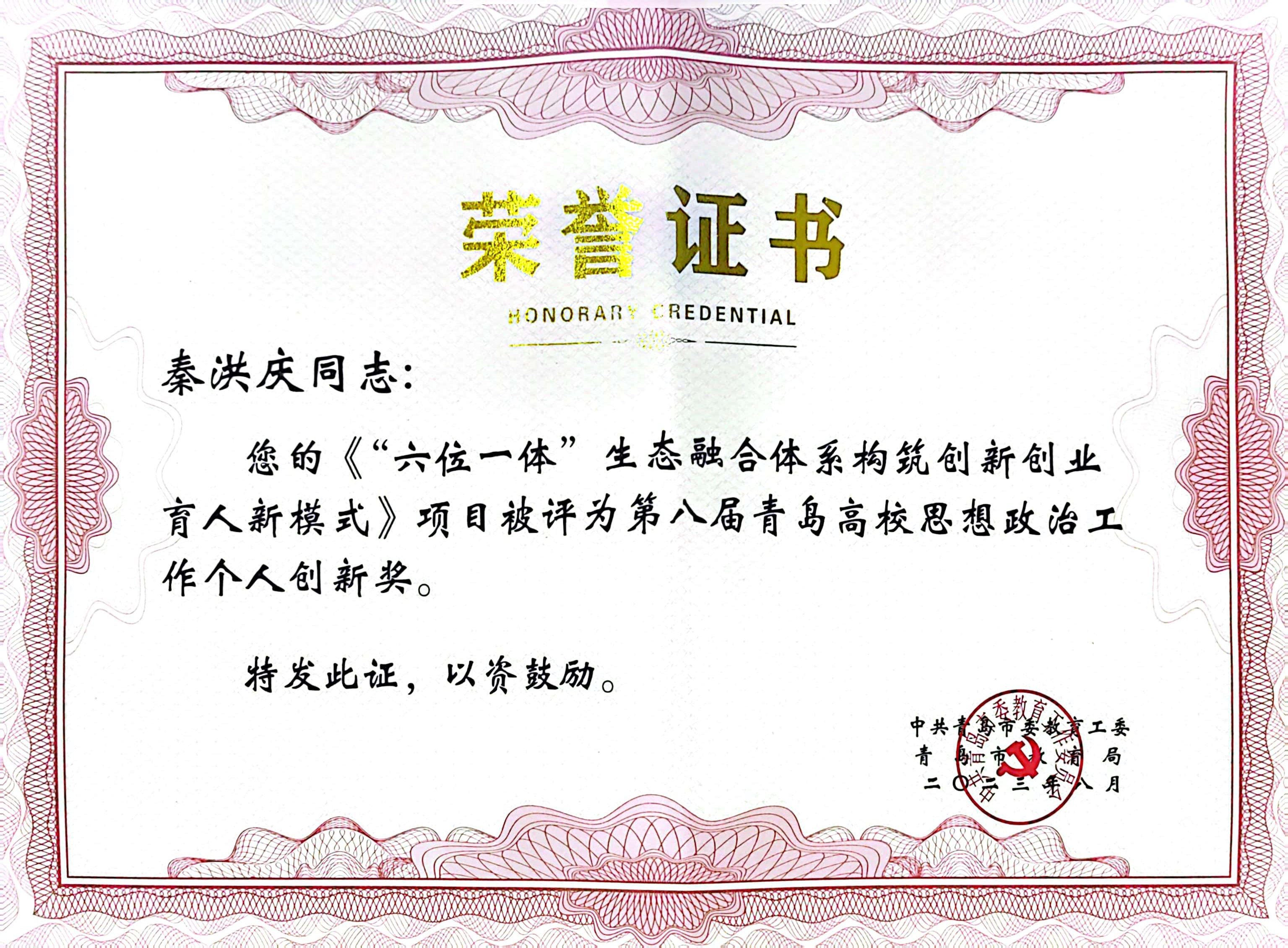 此外,9月10日,青岛市委教育工委公布第八届青岛高校思想政治工作创新奖评选结果,XCSport学工办主任秦洪庆主持申报的《“六位一体”生态融合体系构筑创新创业育人新模式》获评第八届青岛高校思想政治工作个人创新奖。