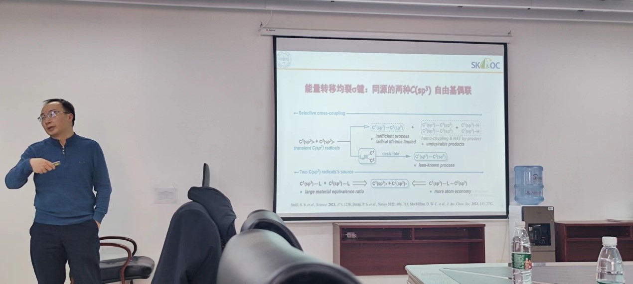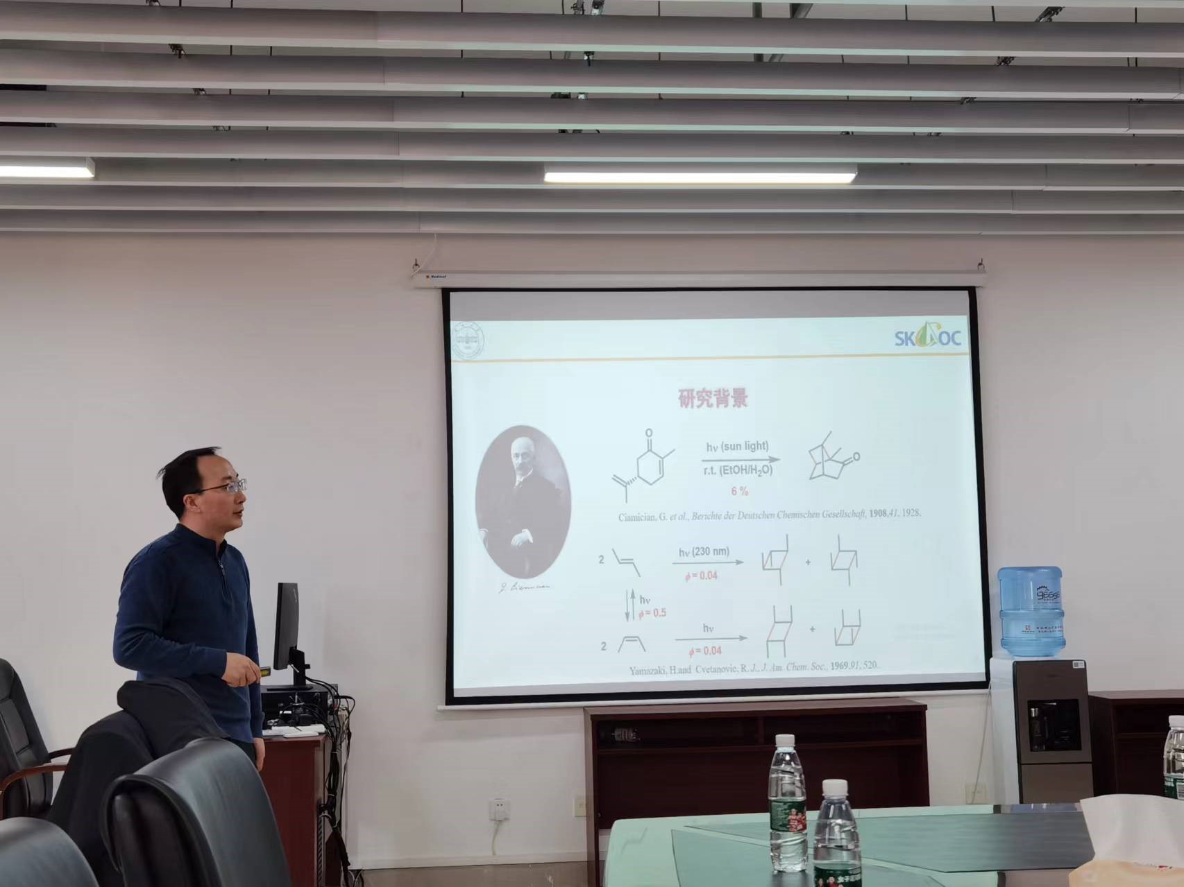 会上,刘教授还基于能量转移均裂δ键:同源的两种C(sp3)自由基偶联反应的优势,以及反应设计所遇到的核心调整等详细阐述。刘教授还基于中性条件下N-NO均裂:可调控的胺肟化反应的核心挑战进行深入讲解,以及对其反应机理研究探索。在此研究设计基础上,开展了在可见光反应条件下,以酰胺为原料“一锅两步”区域选择性去芳构化制备螺环产物。发展了一系列新策略、新方法、新机理、并小结了主要学术贡献与创新点。最后,刘教授针对科学研究中所遇到的困难与在场师生互相交流、互相探讨,并鼓励同学们深入研究反应机理和积极参与到天然产物分子的全合成工作。