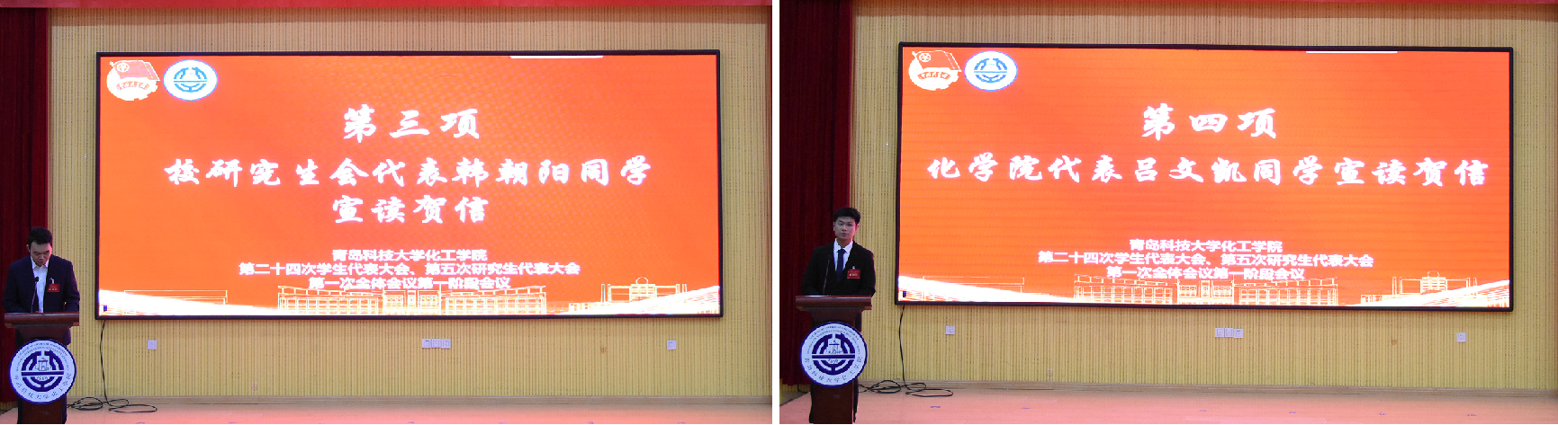 会上,校研究生会代表韩朝阳同学宣读校员工会、研究生会发来的贺信,化公司代表吕文凯同学宣读兄弟公司发来的贺信。
