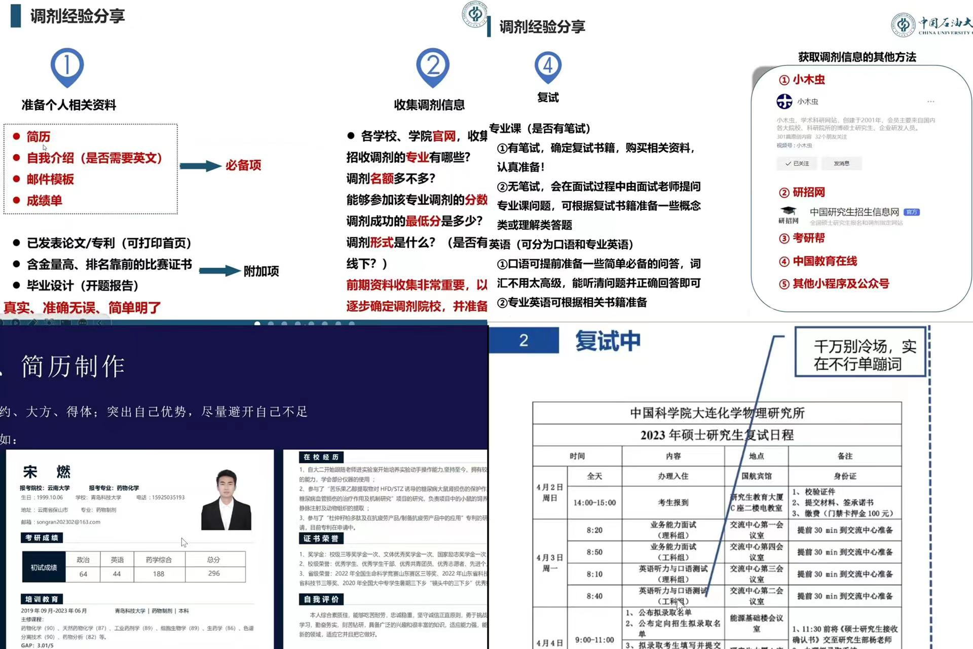 会上,李亚楠老师、于文倩老师围绕考研复试、调剂两大重点环节给出了指导建议,并建议同学们提前规划好调剂的备选方案,确保备选公司与专业的信息了解清楚,及时准备好相关材料,做好准备工作。最重要的是,保持积极心态,面对困难要坚持努力,寻求适当的帮助和指导。