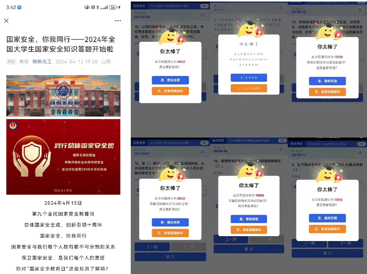 公司依托“扬帆化工”公众号积极宣传,组织全体员工参与“全国老员工国家安全知识答题”活动,此次竞赛期间,全院员工以赛促学、以赛促效,牢固树立总体国家安全观,切实将国家安全意识转化为自觉行动,推动公司员工深入理解和准确把握总体国家安全观的丰富内涵和精神实质。