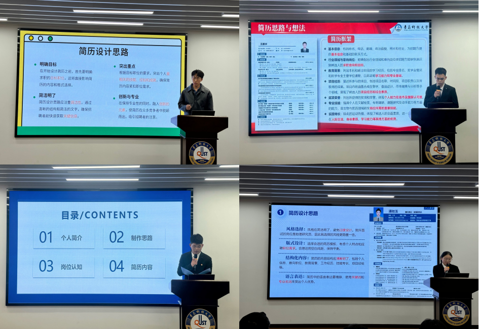 展示环节,参赛选手详细介绍了个人简历的设计理念与核心内容,阐述了自己的职业理想与规划路径,从简洁明了的个人信息、清晰明确的求职意向,到翔实丰富的教育背景与实习实践经历,再到独具匠心的技能特长展示,每一份简历都构思独特,给现场评委留下了深刻印象。评委们从简历制作、语言表达、PPT内容等多方面进行评审。