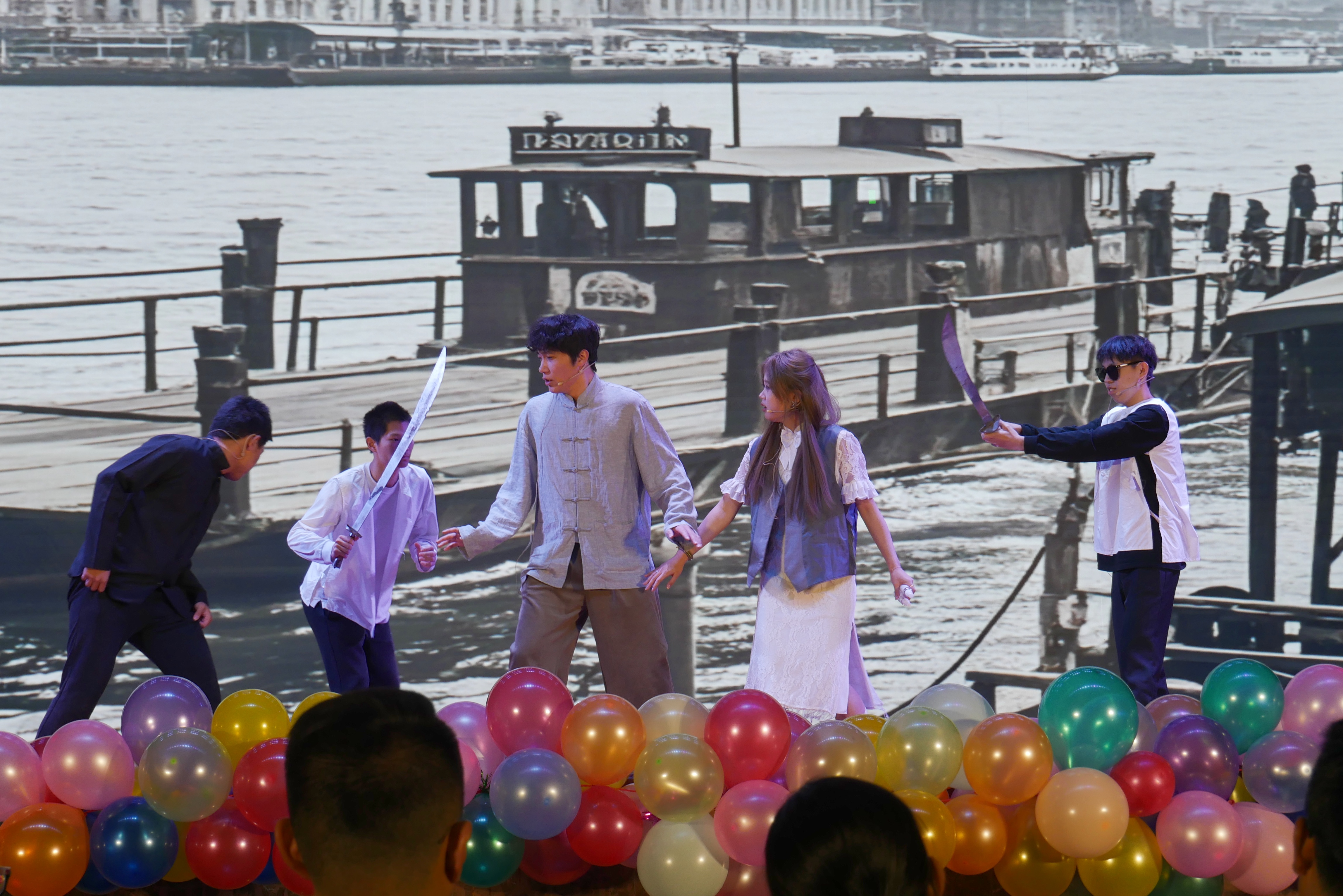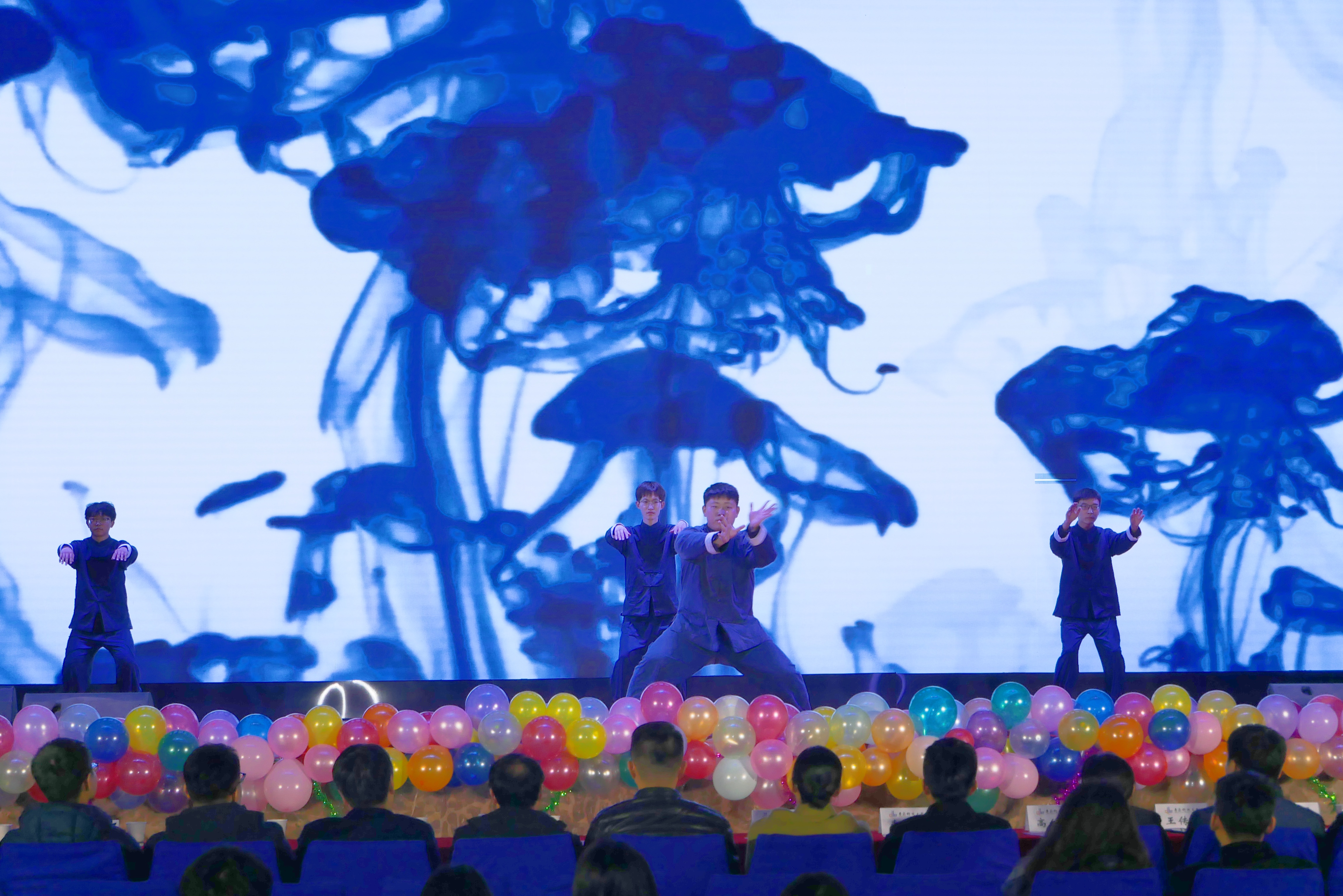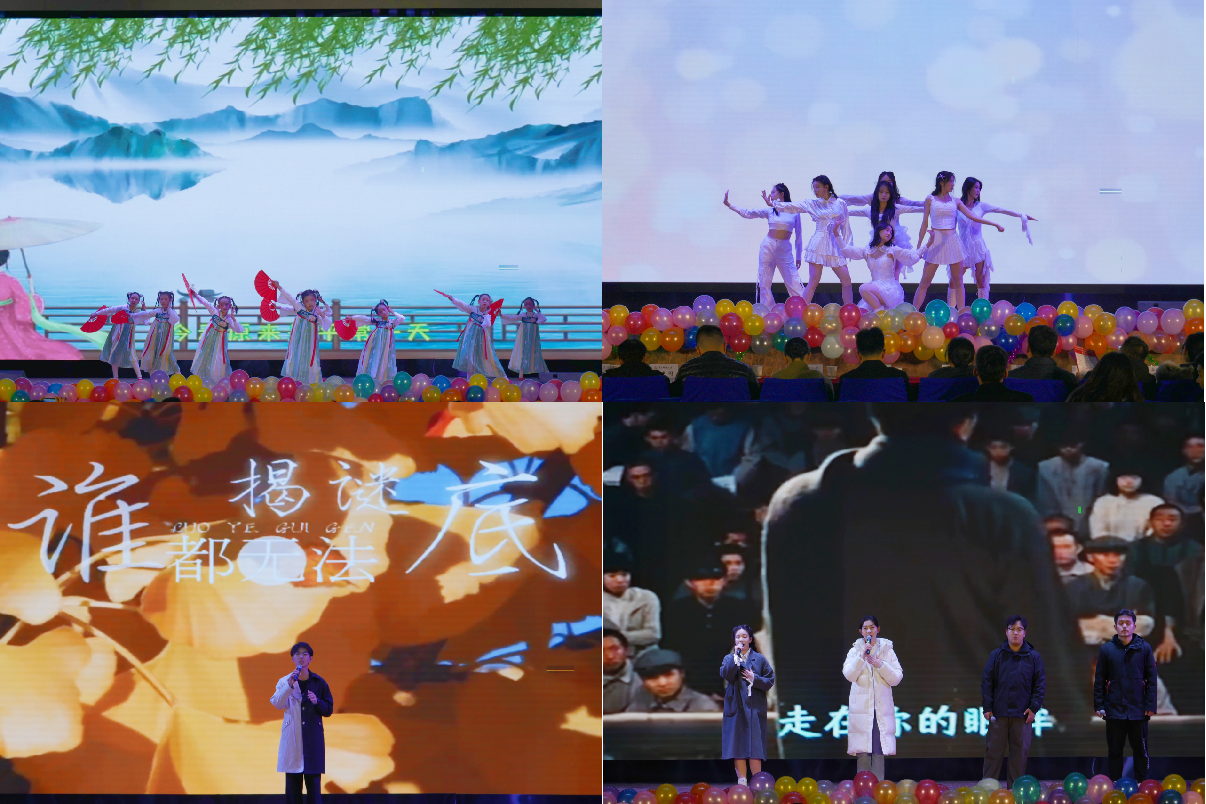 第一篇章,华彩绘梦。由教职工子女表演的舞蹈《上春山》正式拉开了晚会的序幕,一群身着传统服饰的孩子们在舞台轻快地跳跃着,为晚会营造了欢乐、温馨的氛围;DC舞团带来的舞蹈《crazy》以动感的节拍展现青年的朝气、绽放青春的风采;歌曲《落叶归根》演绎了对传统文化的尊重以及对未来的憧憬;话剧《渡口》以幽默风趣的台词,生动活泼的表演,让全场观众捧腹大笑;武术表演《剑心武韵》剑法熟练、动作流畅,传递了中华武术文化的内涵和精髓;歌曲《如愿》温暖美好,触动人心,传递了同学们对未来生活美好愿景的渴望和对当前生活的积极态度。