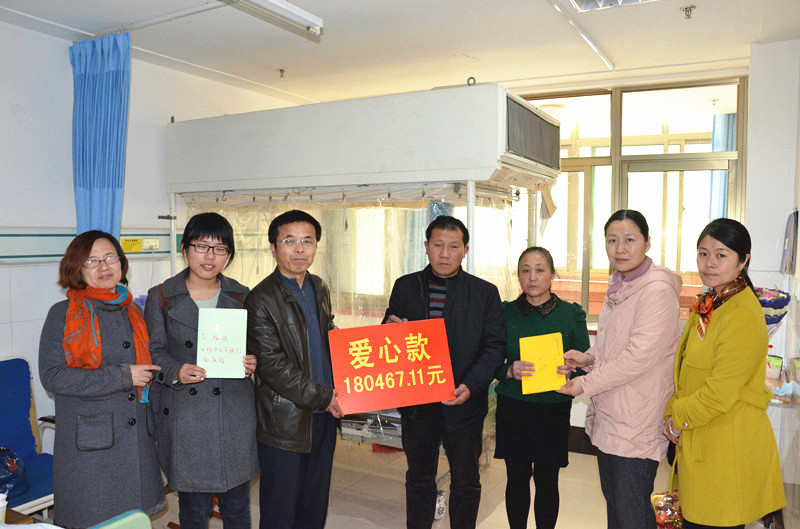 3月20日上午,XCSport经理武玉民、党总支副书记曲斌艳、生物131班班主任吕英涛、13级辅导员王祥梅、刘振川和员工代表刘翔一行六人赴青州市人民医院看望了本院生物131班白血病员工刘雅琪。武玉民代表公司送上了师生及校内外爱心人士委托捐款共计180467.11元,员工代表刘翔送上了师生写给刘雅琪的祝福信件册《我们已思念成疾——致小雅》,师生共同鼓励她坚定治疗信心、争取早日恢复健康。
