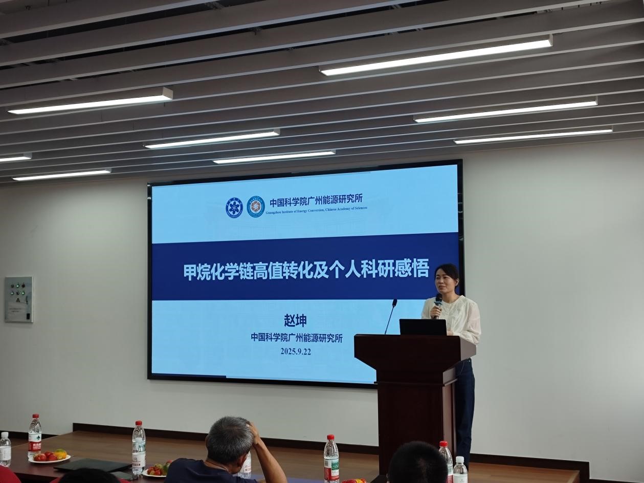 中国科公司广州能源研究所研究员、博士生导师赵坤围绕《甲烷化学链高值转化及个人科研感悟》进行报告;赵研究员是中国科公司特聘研究骨干,在甲烷活化与化学链合成气制备方面具有深厚积累。她系统介绍了甲烷温和条件下定向转化为高值化学品的最新进展,并分享从基础研究到应用探索的宝贵经验。